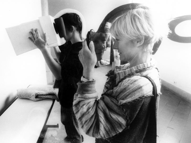 helyspecifikus installáció, vegyes technika (festett papír: felirat a falon + papír, tükör: optikai sisakok + magnóról zörejek)